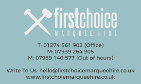 This allows us to ensure your event runs without a hitch. Plus it gives us an opportunity to meet up, and provides you with a chance to ask any questions you may have about the process, and your needs. Click here to set the ball rolling, and receive a comprehensive quote, or simply call 01274 561902 if you’d prefer to talk the matter through first. Some of the companies we have had the privilege of working with. Sometimes you’re searching for more than a simple marquee. Sometimes you are looking for those special touches that will set your event apart from the run-of-the-mill occasion. The kind of details that makes your day linger long in the memory. If this be so, we can help. First Choice Event Hire, our sister company, has been helping people put the cherry, on the icing, on the cake, as long as we’ve been supplying marquees. So they know their stuff. If you’d like to take a look at all those special additions simply click here . Get a feel for what your event might look like, with some examples of popular marquee layouts.
