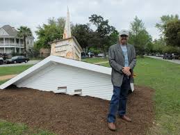 Heights Boulevard has a broad median running from 4th Street to 20th Street, with grass and sporadic metal seating facilities, in effect, a series of mini-parks, and these are being used to great advantage as the venue for an outdoor sculpture exhibition titled "True North, Sculpture on the Boulevard," with one major piece by each of eight artists. Instead of a gallery walk, I had a gallery "drive," proceeding south to north on the boulevard, parking about every two blocks to savor the art. It was my good luck that my visit coincided with that of a family doing the same thing, two parents opening the eyes of their 11-year-old to art, and it was a delight to see their appreciation. Here was art for all ages, as a sense of humor linked the artists, and the works often sparkled with wit. Between 4th and 5th streets is Wildlife Sanctuary by Dan Havel. This is the sculpture that most organically seems to belong. It might be the turret of a church, now sunken into the ground at an odd angle, or it might have been carried there by alluvial silt as a great river overflowed.